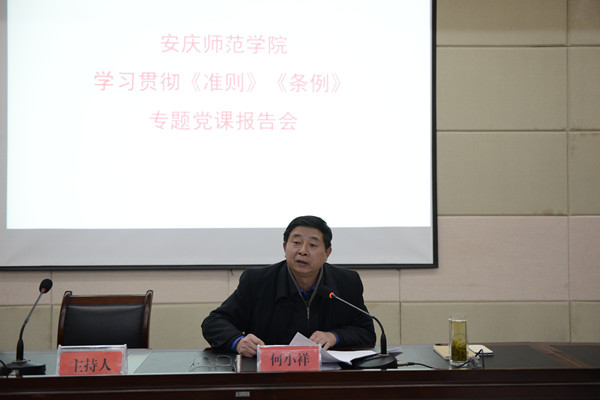 何小祥书记精辟论述了《准则》《条例》的出台背景、重要意义和精神实质,全面阐释了《准则》《条例》的的主要内容、深刻内涵和鲜明特征。他强调,《准则》是坚持正面倡导、规范全党廉洁自律工作的重要基础性法规,《条例》是管党治党的尺子,划出了党组织和党员不可逾越的行为底线。认真学习贯彻《准则》和《条例》,对于深入推进党要管党、从严治党,永葆党的先进性和纯洁性,对于协调推进“四个全面”战略布局,对于全面贯彻党的教育方针、努力培养德智体美全面发展的社会主义建设者和接班人,具有十分重大而深远的意义。