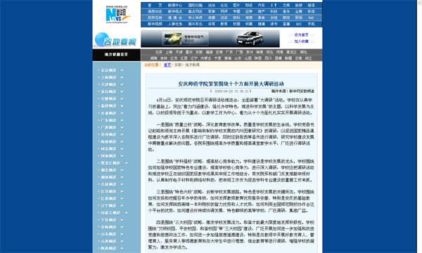 4月20日,新华网在各地要闻栏目中以 “安庆师范学院紧紧围绕十个方面开展大调研活动” 为题播发了永利官网大调研活动新闻。4月21日,安徽省教育厅在“省属高校深入学习实践科学发展观专题网站”中随即进行了转载。