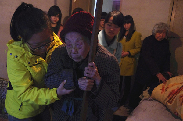 将老人扶到床上,志愿者开始和老人聊天。“奶奶您冷吗?手怎么这么冰?我手热,帮您暖暖。”13级环境科学的陶春香是“红太阳”志愿服务队的队长,也是志愿工作做的最多的同学。“我们能做的太少了,很多时候都觉得自己没有能力帮助她们。”陶春香说,“当初我加入志愿者队,就是希望帮助他人,这个平台给了我机会。”