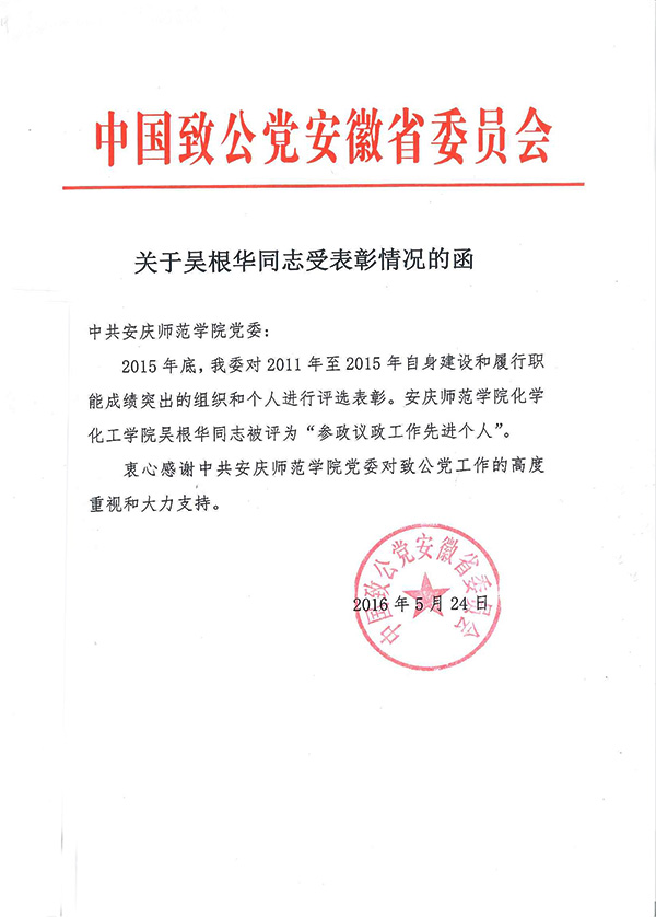 近日,致公党安徽省委致函永利官网党委,2015年底致公党安徽省委对2011年至2015年自身建设和履行职能成绩突出的组织和个人进行评选表彰,永利官网吴根华教授被评为“参政议政工作先进个人”。