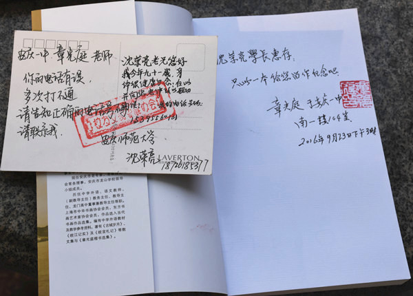 “沈荣亮老兄您好,我今年九十一岁,身体很健康,勿念,在此并向您老伴致以亲切问候。”写完回信,章光庭老人将一本自己写的书交给送信的同学,让他帮忙送给沈荣亮。“你告诉他这是最后一本了,本来是我自己留着的。”章光庭说,“你回去问问他还记不记得上军事训练课王奋同被罚的事,我最喜欢的老师是当时教几何的王世琦老师,你回去问他还记不记得……”