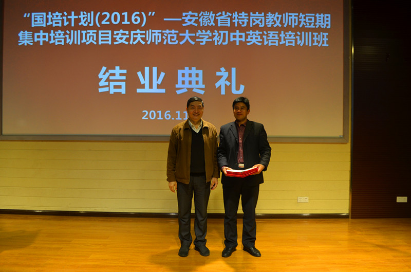 11月18日上午, 学校举行国培计划(2016)”安徽省特岗教师短期集中培训项目初中英语班结业仪式。副校长张群教授出席结业仪式并为学员颁发结业证书和荣誉证书。