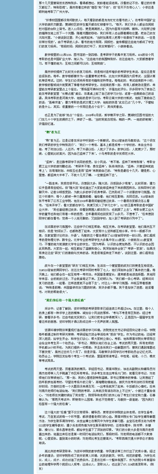 宣传部得知消息后,立即安排人手前往资环学院进行深入采访和挖掘,采写了《百年学府又爆出重大新闻:资环学院一班级45人报考研究生录取43人》,稿件随即被新华网、中安在线等媒体刊登,在社会上引起强烈反响。人民网、中国网、中国研究生招生网、中国考研网、国家教育信息网等媒体纷纷予以全文转载,新安晚报、江淮晨报、皖江晚报、安庆晚报等报刊也派遣记者前来采访,整版或者突出位置予以报道。目前,共有10多家重要媒体对此事进行了报道。(宣传部)
