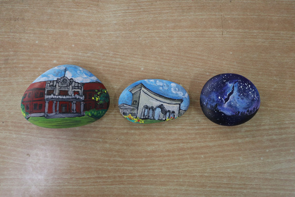 除了红楼,敬敷书院、龙山校区大门……学校的各个建筑、各个角落都是赵子聪石头画的重要素材。为了让学校的建筑“活”在石头上,她精心挑选校园风光照片摆在眼前对照,耐心画上好几个小时。赵子聪说:“比较简单的画一般四十分钟左右就可以完成,像红楼这种画起来比较复杂的学校建筑,要花两三个小时甚至一下午的时间。”
