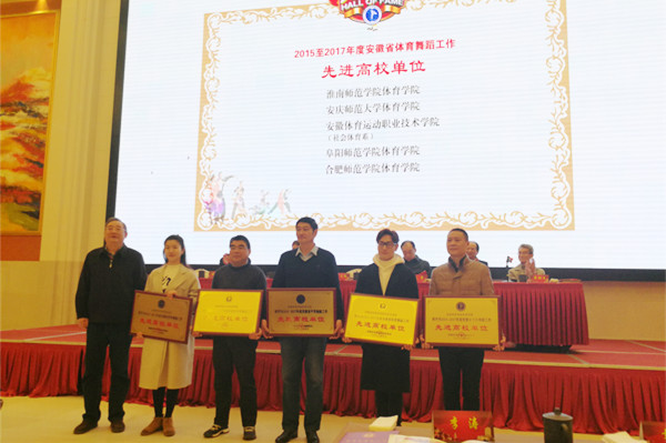 2日2日,2017年安徽省体育舞蹈协会年会暨表彰大会在合肥举行,永利官网体育学院荣获2015-2017年度安徽省体育舞蹈工作“先进高校单位”称号,体育学院副院长章翔、体育舞蹈专业教师夏尚群分别荣获“优秀工作者”称号。