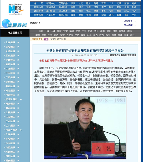 3月25日,新华网在首页安徽要闻位置报道了程艺厅长来永利官网作首场报告的新闻,这是3月20日新华网报道永利官网召开深入学习实践科学发展观活动动员大会后,永利官网学习实践活动再一次被新华网报道。