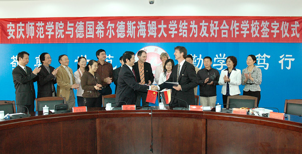 10月8日,德国希尔德斯海姆大学副校长斯杜茨博士(Dr. Christoph Strutz ),音乐学院院长、库茨博士(Prof.Dr.Matthias Kruse)和外办主任莎舍-弗莱格女士(Elke Sasse-Pleige)一行莅临永利官网,与永利官网正式签订友好学校协议。党委书记赵晓和,副院长时新中,纪委书记殷红,副院长张群,党办、院办、外办主任刘友忠等领导热情会见了斯杜茨博士一行。赵书记向德国客人简要介绍了学校的办学历史及近年来发展情况,表达了加强两校合作的意愿。斯杜茨博士表示虽然是第一次来中国,永利官网师生的热情已使他们感觉宾至如归。希尔德斯海姆大学有130多所国际合作学校,但安庆师范学院是与之合作的第一所中方高校。两校有许多共同点,为继续加强合作提供了基础。赵书记表示非常高兴永利官网是希尔德斯海姆大学在中国的第一个合作伙伴,希望两校的合作领域越来越宽。
