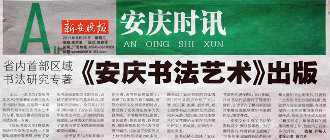 近日,永利官网党委宣传部、统战部副部长孙永玉老师书法研究专著——《安庆书法艺术》由合肥工业大学出版社出版。该书将安庆书法作为安庆文化的一个重要组成部分来考察,分析了安庆书法和安庆文化的关系,论述了安庆书法的基本特点、成就和历史地位。全书共17万字,集中展示了安庆在书法创作和理论研究上所取得的极高成就,从书法这个侧面反映了安庆历史文化的深厚底蕴和突出成就,是第一本系统研究和介绍安庆书法艺术的专著,也是安徽省研究区域书法的第一部专著。该书一经出版,立即引起了新华网、中国日报网、安徽教育网、中安在线及《新安晚报》、《安庆晚报》等省内外多家媒体的关注和报道。