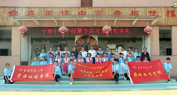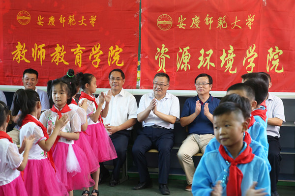 7月25日下午,校党委书记许继荣在资源环境学院、教师教育学院、校团委有关负责人的陪同下,来到大观区十里中心学校,看望正在开展暑期“三下乡”社会实践活动的“心手相牵 阳光童行”志愿服务团师生,并给实践队员送去慰问品。大观区区委副书记、区长潘功发,大观区区委常委、宣传部部长贺彦明,区教育局、区团委和十里中心小学校长等领导也来到学校看望暑期实践学生。