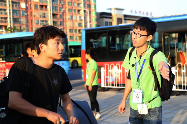 清晨5点20分,一辆满载志愿者的公交车从学校出发,开往火车站,迎接到站的第一批新生。从出站口到集合平台,一路上整齐地站着身着绿色衣服的志愿者,为新生们提供一条龙式的引导服务,让新生们感受到“回家”的温暖。