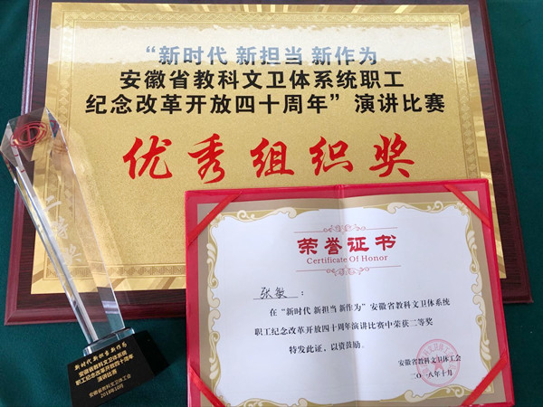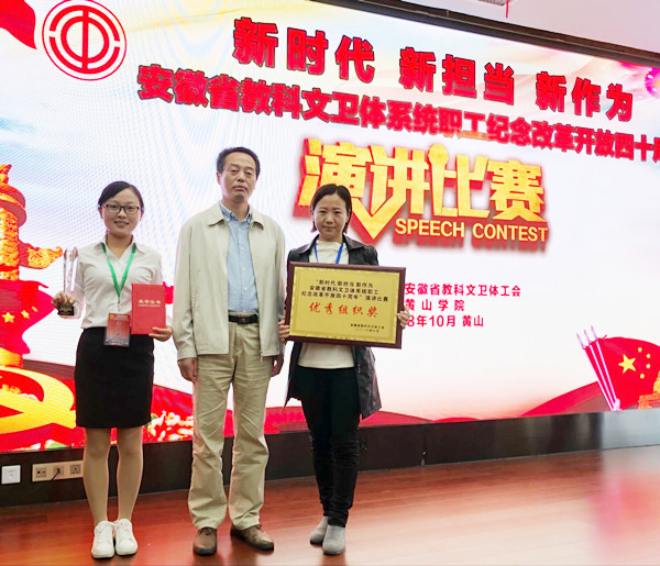 10月30日至31日,由安徽省教科文卫体工会主办,黄山学院承办的“新时代 新担当 新作为”安徽省教科文卫体系统职工纪念改革开放四十周年演讲比赛在黄山举行。永利官网工会选送选手、数学与计算科学学院张敏老师荣获二等奖,校工会获得“优秀组织奖”。