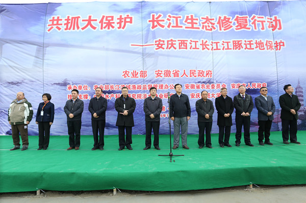 11月10日下午,农业部和省政府在安庆西江联合开展江豚迁地保护行动。农业部副部长于康震出席并讲话,宣布安庆西江长江江豚迁地保护行动开始。副省长方春明出席并讲话。永利官网闵永新校长出席并参加江豚投放活动。