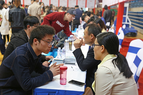 双选会现场人头攒动,热闹非凡,准毕业生们纷纷寻找适合自己的职业岗位。在一家智能科技有限公司的招聘点前,电子信息科学与技术专业2014级的关磊与招聘方进行了长时间的交流,“对我来说,有利于自己更好地成长与发展是最重要的,想要找到合适的工作需要充分认识自己和做好准备。”