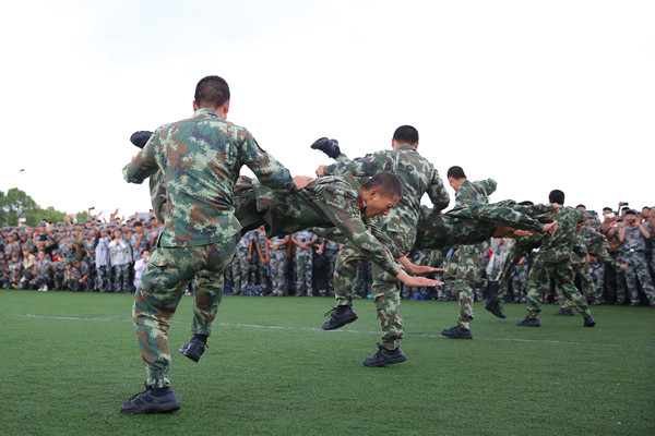 2017级新生穿着迷彩服,迈着整齐的步伐,以矫健的身姿、嘹亮的口号在雄壮的军歌中开始了分列式表演,充分展示了他们两周以来的训练成果。教官方队进行了精彩的军体拳表演,这些保卫祖国安全统一、维护社会稳定发展的卫士展示了共和国军人的帅气雄姿,全场爆发出连绵不断的雷鸣般的掌声。