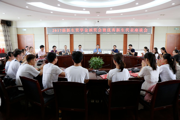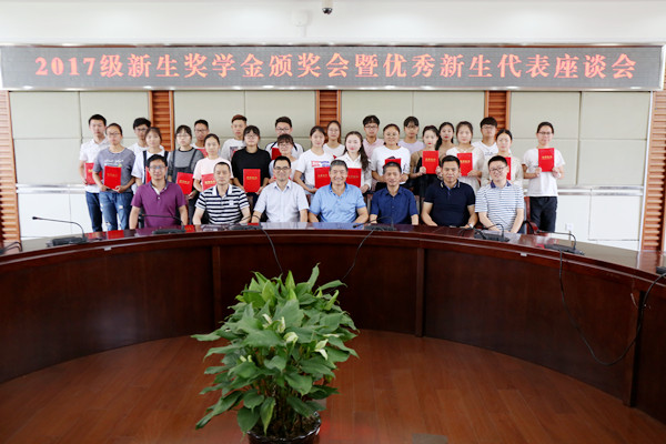 6月13日下午,学校召开2017级新生奖学金颁奖会暨优秀新生代表座谈会。副校长张群,宣传部、教务处(招生办公室)、学生处、财务处等部门负责人、部分优秀新生奖学金获奖代表参加了会议。会议由教务处(招生办公室)负责人主持。