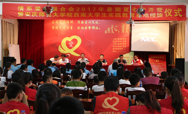 7月8日下午,桐城市情系爱心联合会2017年暑期夏令营开营暨yl23455永利官网皖西南大学生实践教育基地授牌仪式在情系助学服务中心二楼多功能厅举行,副校长汪时珍,桐城市委常委、人武部政委刘朝辉出席仪式,校团委、桐城市直相关单位、情系爱心联合会等负责同志,情系义工、“三下乡”志愿者和夏令营学生共百余人参加仪式。