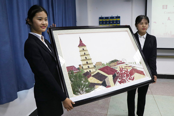 同样,在生物标本作品《宜城振风》中,振风塔作为安庆的精神文明象征成为了作品的主角。谈到作品创意时,团队成员桂祥说:“古时振文风,今朝振文明,我们的作品是我们团队结合园林专业景观设计知识献给安庆城的赞歌。”他介绍,不仅是画面中心的振风塔让人费尽心思,为了呈现塔下建筑的光影效果,团队成员们特意使用了颜色深浅变化最细微的南天竺。
