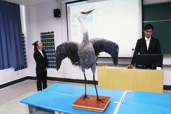 “这是一只白头鹤,国家一级野生保护动物,它的造型非常独特,看起来像是想要展翅高飞又依依不舍。”比赛现场,团队成员王雪这样介绍他们的动物标本作品《一步三回首》。
