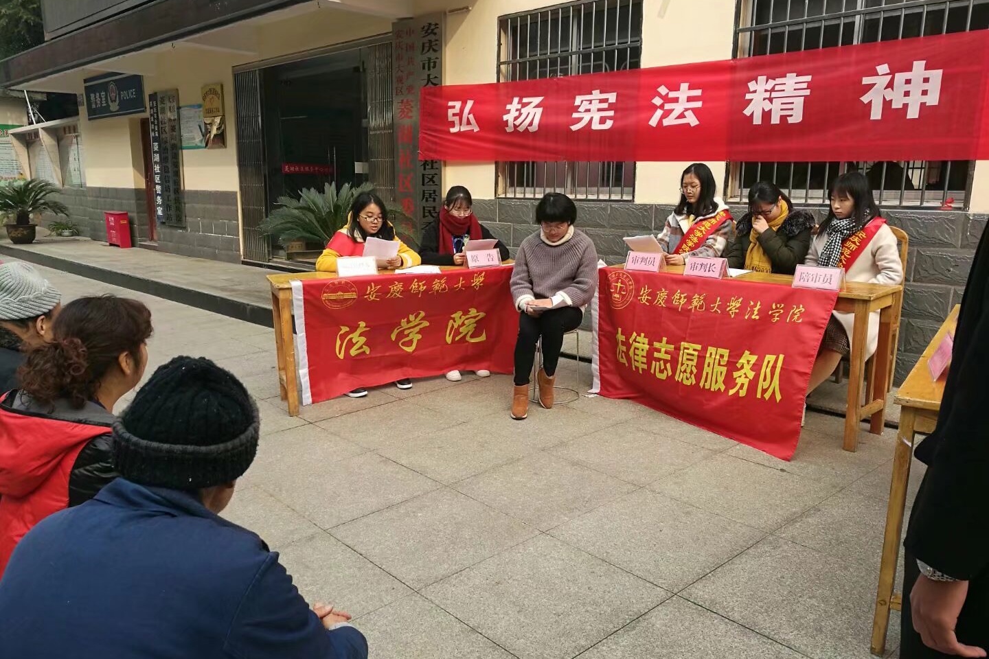 安庆大观区人民法院诉讼服务中心为法学院大学生法律志愿者设立了“大学生志愿者服务”窗口,并为志愿者进行“岗前”培训,开展包括提供法律咨询、代写起诉材料、给予诉讼引导等法律服务活动。此外,大龙山镇、大桥街道、菱湖社区、安庆高铁站、永林小学等单位对法学院法治文化节期间的普法宣传活动在活动场地安排、动员组织群众、媒体宣传报道等方面都给予了大力支持。(武奎)