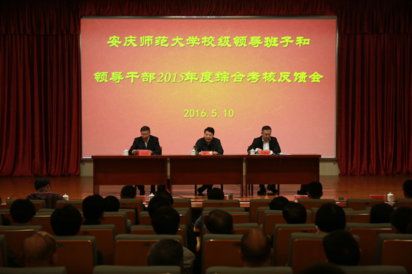 5月10日上午,省委第十八考核组副组长、省教育厅副厅长、省委教育工委委员解平和第十八考核组成员到永利官网反馈2015学年学校领导班子年度综合考核情况。校领导许继荣、闵永新、殷红、张群、刘友忠,省政协常委何小祥等出席会议,党委委员陈光明、方锡球及学校机关各部门副处级以上干部,院系党政主要负责人,省级以上党代表、人大代表和政协委员,民主党派市级以上主委,校教代会执委,全体正高职称人员和学生代表参加会议。
