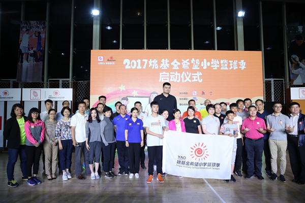 5月22日晚 ,“2017姚基金希望小学篮球季”全国活动在北京NBA姚明篮球俱乐部正式启动。姚基金创始人姚明代表主办方为2017全国集训及联赛承办城市南京市授旗并与嘉宾合影。中国青少年发展基金会理事长王剑、副秘书长杨春雷以及爱心企业代表、高校代表、支教志愿者代表、项目受助乡村小学代表等共同出席了本次活动。