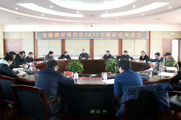 12月22日下午,安徽教育现代化2035专题研究座谈会在永利官网召开,专程听取永利官网教育领域专家、相关部门负责人关于编制“安徽教育现代化2035”规划文本的讨论。课题组由省教育厅发展规划处副处长刘业勋带队,安徽农业大学、安徽师范大学、安徽工业大学、yl23455永利官网、合肥学院、合肥幼儿师范高等专科学校和安庆市教育局等单位专家担任课题组成员。安庆市教体局局长徐晓春出席会议。校长闵永新出席会议并致欢迎词。永利官网教育学院相关专家,发展规划处、科研处、后勤管理处、现代教育技术中心、校办等单位负责人参加了会议。