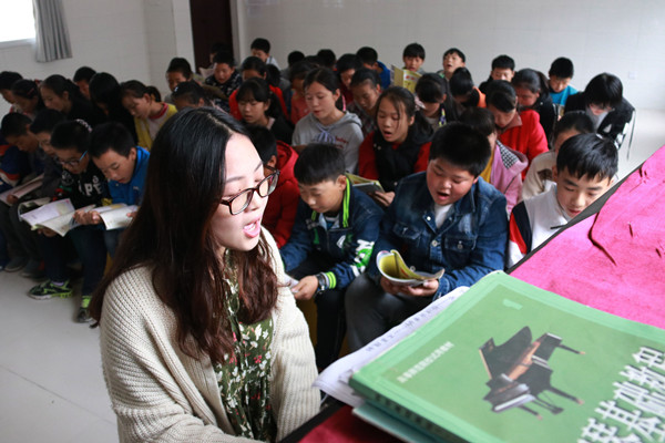 金寨县泗河实验学校初中部,音乐学专业支教成员唐晶晶正在给学生们上音乐课。图为她带领大家一起演唱《爱我中华》。