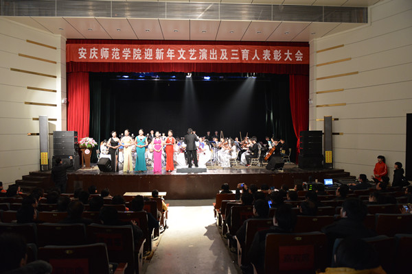 12月30日下午,永利官网龙山校区音乐厅内华灯璀璨、流光溢彩,校迎新年文艺演出暨三育人表彰大会在这里隆重举行。校党委书记何小祥,党委副书记、院长闵永新,党委副书记、纪委书记殷红,党委委员、副院长张群,党委委员、副院长刘友忠,党委委员陈光明、方锡球,“三育人”先进个人等各类受表彰人员,全校处级干部,校教代会执委、工会委员会委员、基层工会主席和各单位教师代表、学生代表近500人参加了大会。
