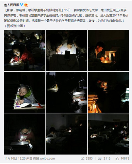 北京时间:为考研梦!校园停电学子用手机蜡烛照明坚持复习