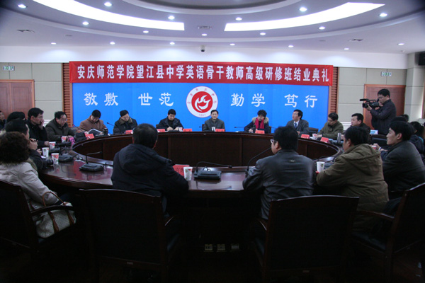 1月7日下午,安庆师范学院望江县中学英语骨干教师高级研修班在行政楼圆桌会议举行隆重的结业典礼。校党委副书记、副院长朱士群,副院长张群,望江县县委常委、副县长张怡,安庆市教育局副局长林华亮,望江县教育局局长王振华,安庆市教育局人事科科长于琪峰,望江县教育局副局长徐应和出席了结业典礼。领衔本次研修工作的教务处和外国语学院主要领导、教师代表以及研修班39名研修班学员参加了结业典礼。会议由教务处处长程曦主持。