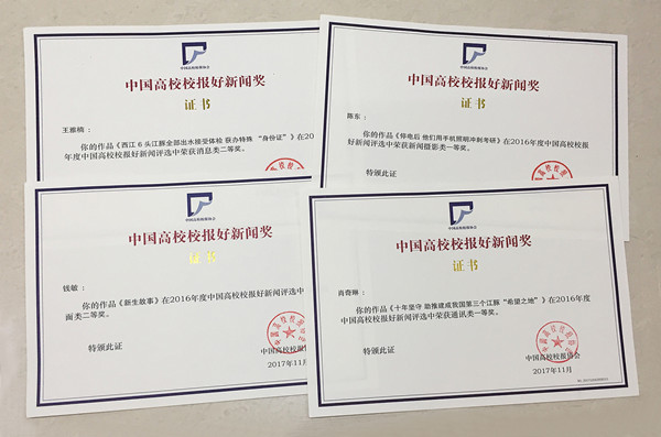 党委宣传部陈东老师拍摄的《停电后 他们用手机照明冲刺考研》获新闻摄影类一等奖,且在该类别排名第一;学生记者肖奇琳采写的《十年坚守 助推建成我国第三个江豚“希望之地”》获通讯类一等奖;学生记者王雅楠采写的《西江6头江豚全部出水接受体检获办特殊“身份证”》获消息类二等奖;宣传部钱敏老师编辑的版面《新生故事》获版面类二等奖。