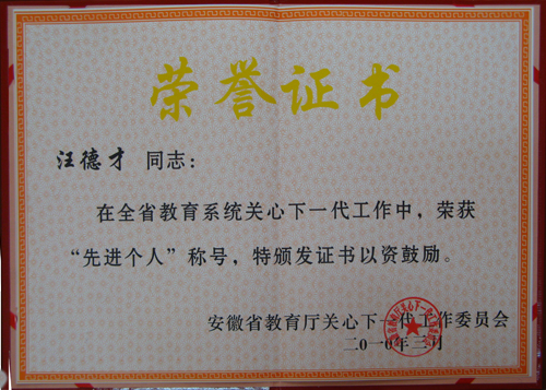 日前,全省教育系统关心下一代工作会议在合肥召开,永利官网荣获2009年全省教育系统关心下一代工作考评两项荣誉称号,永利官网教学督导组被省教育厅授予“安徽省教育系统关心下一代工作先进集体”荣誉称号,退休教师、原教学督导组组长汪德才同志被省教育厅授予“安徽省教育系统关心下一代工作先进个人”荣誉称号。