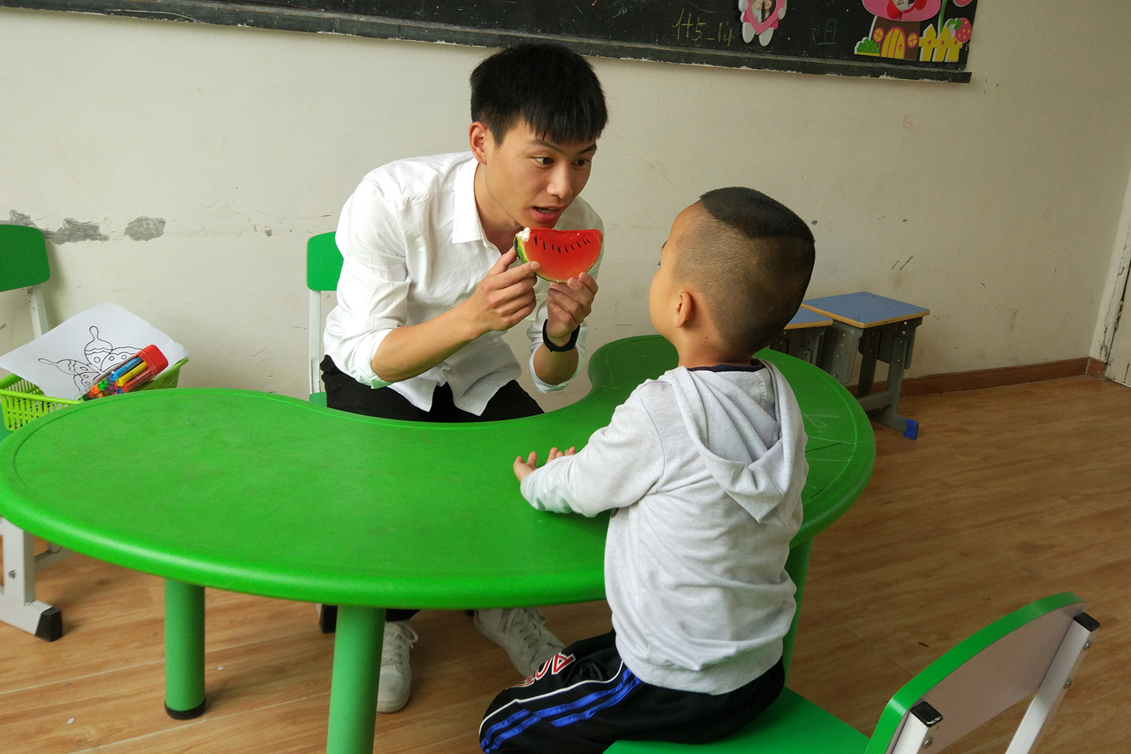 和特殊儿童相处,最需要耐心。因为身心的缺陷和障碍,他们往往不能控制自己的情绪和行为,甚至做出反常甚至攻击性行为,很多人可能无法忍受,但对两位支教大学生而言却是家常便饭。汪佳芮说,在学校里他的鞋子和裤腿从来就没干净过,稍不留神学生就会跑过来踩上一脚。郑法祥带两个班的感统课,和学生的肢体接触比较多,被学生掐、抓是常有的事。两人从没有一句抱怨。