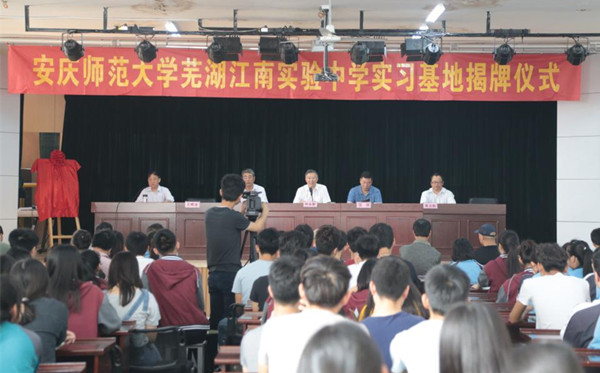芜湖市江南实验中学是今年永利官网新设的教育实习基地,在22日上午举行的yl23455永利官网教育实习基地签约揭牌仪式上,闵永新向该校骨干教师、中层以上干部、高三年级全体学生介绍了永利官网的办学历史、办学条件、教学科研情况。他通过一名学生在芜湖江南实验中学转变、成长、成才的真实事例,勉励每一位同学树立信心,欢迎更多的同学报考yl23455永利官网,学校期待与同学们一起追梦前行。