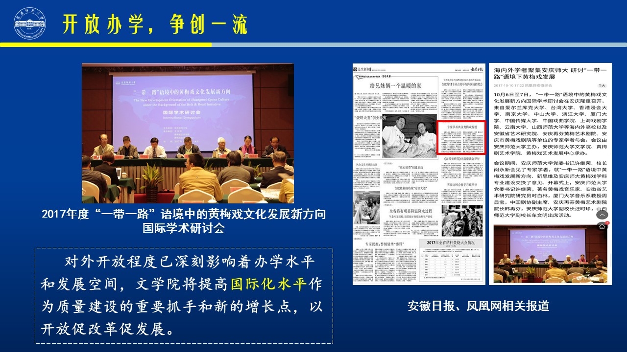 “百年大计,教育为本”。党的十九大报告提出优先发展教育事业,明确了高校要“加快一流大学建设和一流学科建设,实现高等教育内涵式发展”。回顾近年来的发展脉络,文学院始终坚持在人才培养、科学研究、服务社会、文化传承与创新中,体现有特色和高水平。同时,全面贯彻党的教育方针,在办学实践中不断探索内涵式发展的科学路径,坚持“做特色文章,创一流学科”的发展理念。经过多年的建设与发展,文学院办学实力得到了社会的高度认可,已经并将继续把地域特点变成学科特色,把区域劣势转化为科学研究优势,以研究解决安徽地区文化发展、大别山区域发展与“一带一路”建设中的国家战略问题为己任,真正体现了中文品牌、地域特色和高水平。