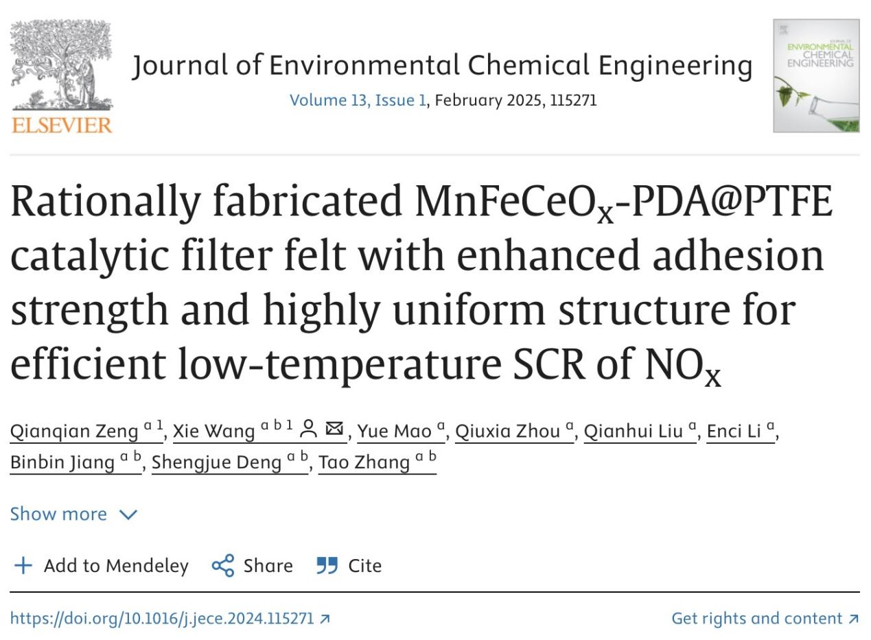 近日,化学化工学院化学2022级本科生曾倩倩以第一作者身份在国际知名杂志《Journal of Environmental Chemical Engineering》(中科院TOP期刊,影响因子为7.4),发表题为“Rationally fabricated MnFeCeOx-PDA@PTFE catalytic filter felt with enhanced adhesion strength and highly uniform structure for efficient low-temperature SCR of NOx”的研究性学术论文。该论文以yl23455永利官网为唯一完成单位,学院教师汪谢为论文的共同一作及通讯作者,另有材料化学及化学专业多名本科生及教师为共同作者。